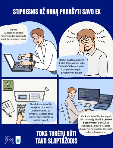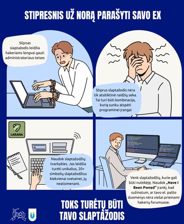 Stiprus slaptažodis nėra tik atsitiktinė raidžių seka. Tai kombinacija, kurią sunku atspėti net galingiausiai programinei įrangai.