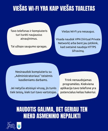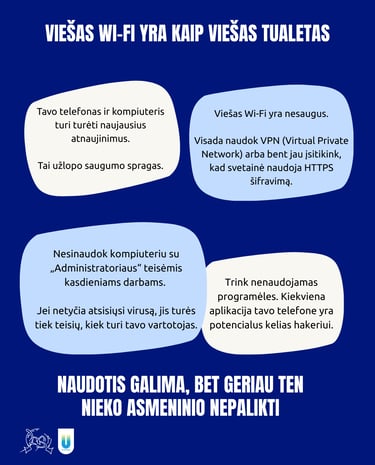 Viešas Wi-Fi: patogu, bet pavojinga Kavinės ar stoties Wi-Fi yra puiki vieta duomenų vagystėms. Jei privalai juo naudotis, visada įsijunk VPN (Virtual Private Network) ir stebėk, ar svetainės adresas prasideda HTTPS. Ta raidė „S“ (Secure) reiškia, kad tavo siunčiami duomenys yra šifruojami.
