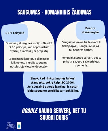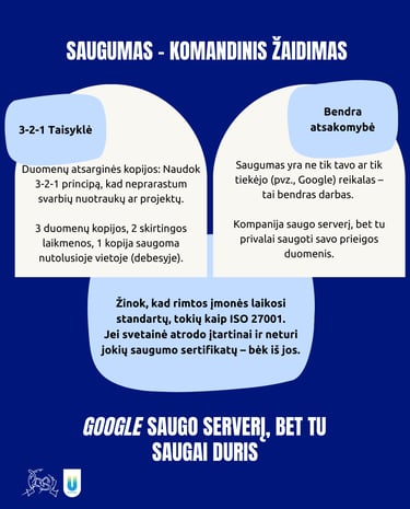 Saugumas – bendras darbas (Shared Responsibility) Daug kas mano: „Aš naudoju Google, jie pasirūpins mano saugumu“. Tai tik pusė tiesos. Kompanija saugo serverius nuo įsilaužimų, bet jei tavo slaptažodis bus „12345“ – tai bus tavo, o ne tiekėjo spraga. Saugumas yra bendradarbiavimas: kompanija saugo infrastruktūrą, o tu saugai savo raktus (prieigos duomenis).