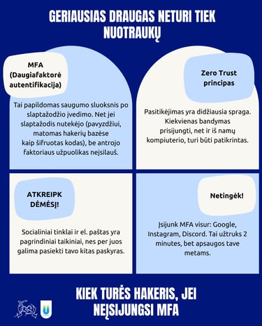 Šiuolaikiniame internete galioja „Zero Trust“ (nulinio pasitikėjimo) principas. Tai reiškia, kad pasitikėjimas yra laikomas didžiausia saugumo spraga. Nesvarbu, ar jungiesi iš savo kambario, ar iš naujo telefono – kiekvienas bandymas prisijungti privalo būti patikrintas. Hakeriams nebereikia spėlioti tavo slaptažodžio, jei jie gali tave apgauti, tačiau tu gali užrakinti duris iš vidaus.